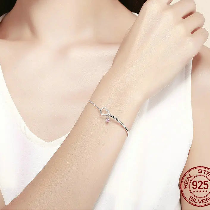 Heart Pink CZ Chain Link Bangles Bracelets for Women Sterling Silver Jewelry SCB117