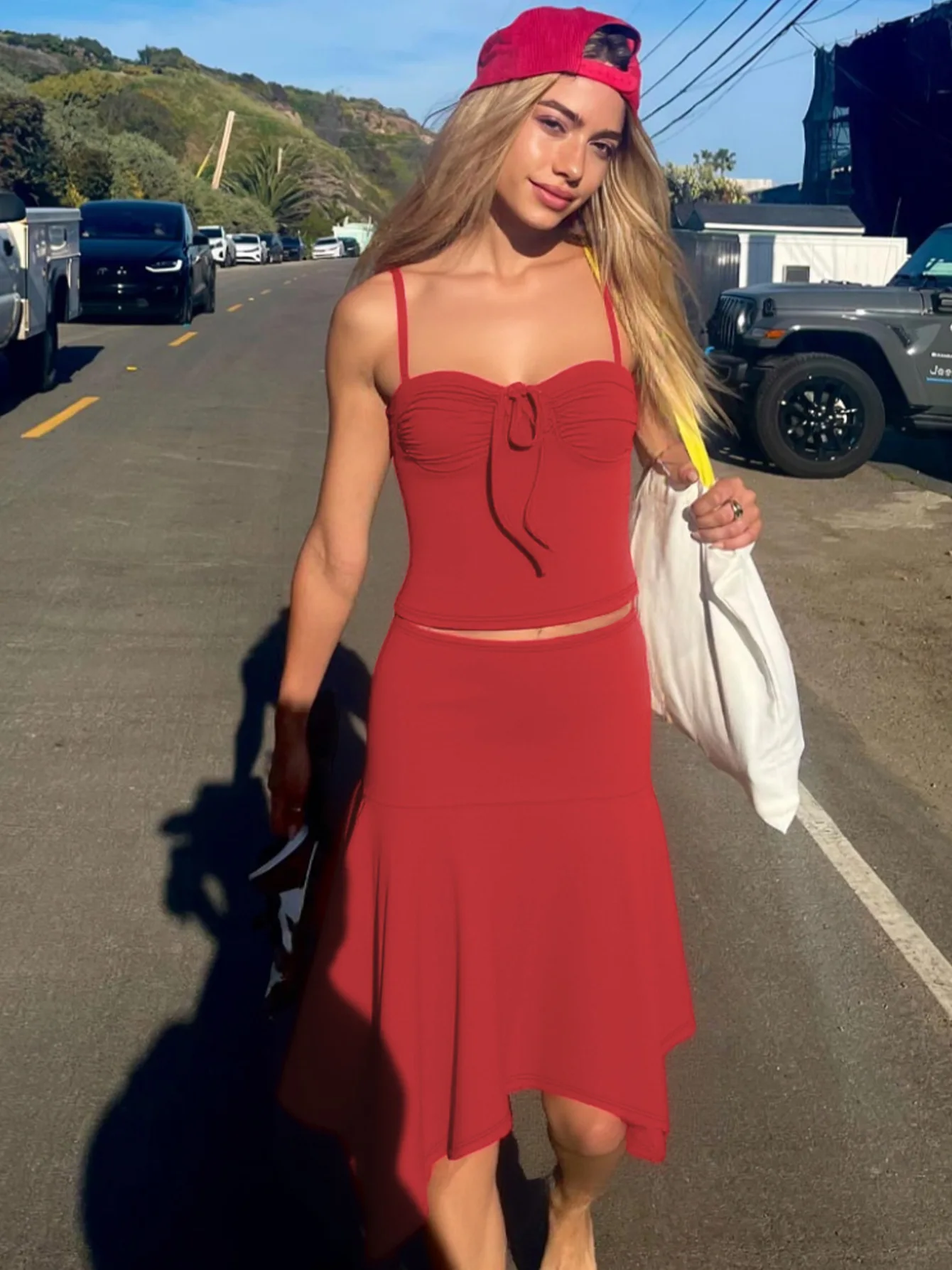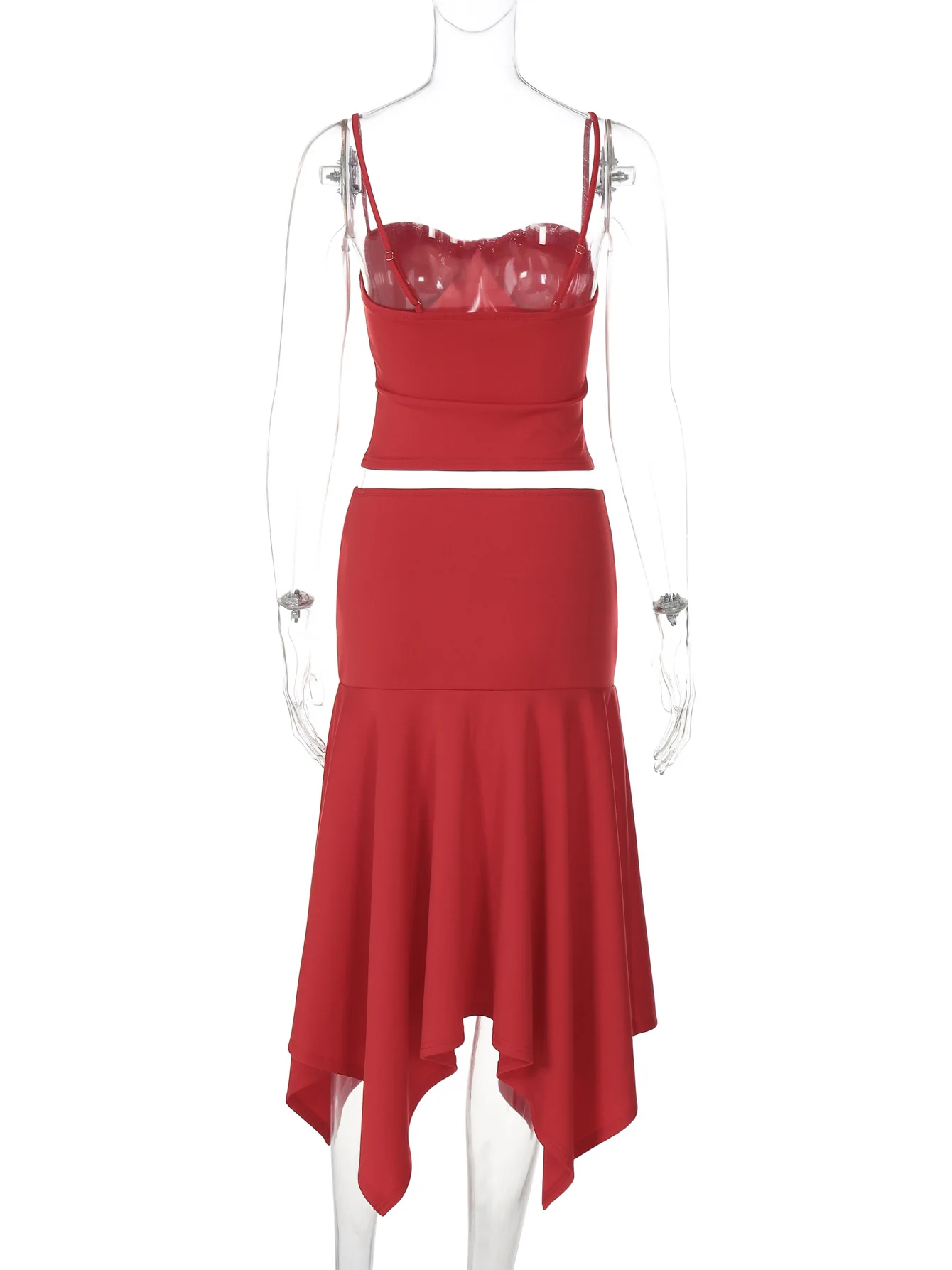 Woman Clothing Sexy Lace-up Camisoles Top+Asymmetrical Midi Skirts Set Holiday Beach Outfit Black Red Solid Dresses 2 Piece Sets