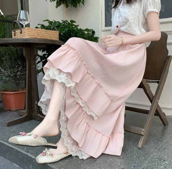 Japanese Ruffles Pleated Skirt Woman Sweet High Waist Loose Ankle-length Skirts Women College Style