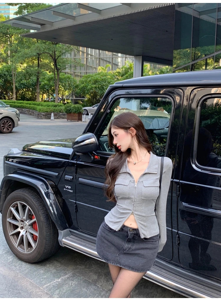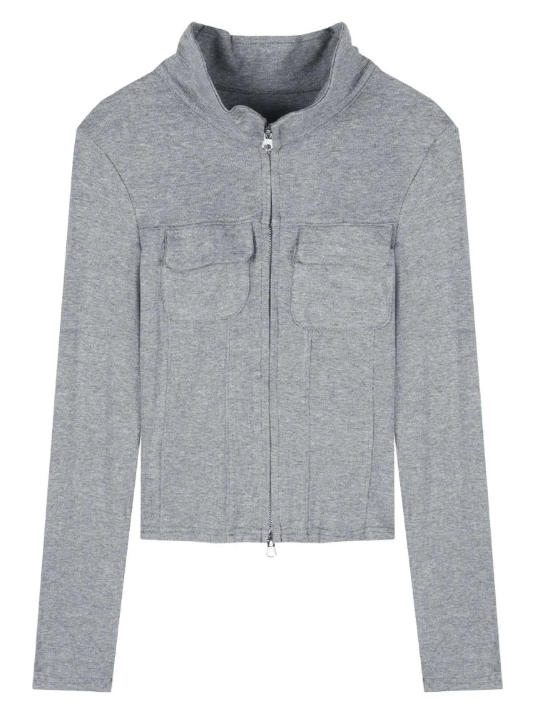 Women T-shirt Spring Autumn Clothes Ribbed Knitted Long Sleeve Short Tops Zipper Design Tee Sexy Female Slim Tops