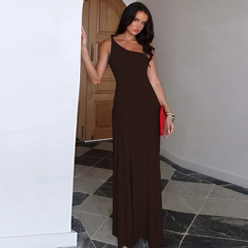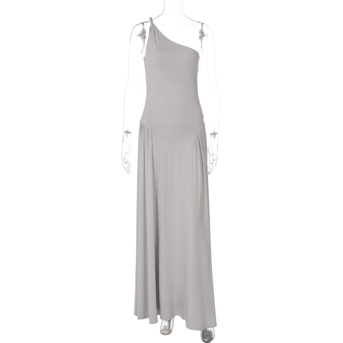 Autumn One Shoulder Diagonal Collar Long Maxi Dress Women Elegant Sleeveless Ruched Asymmetrical Party Evening Prom Dresses