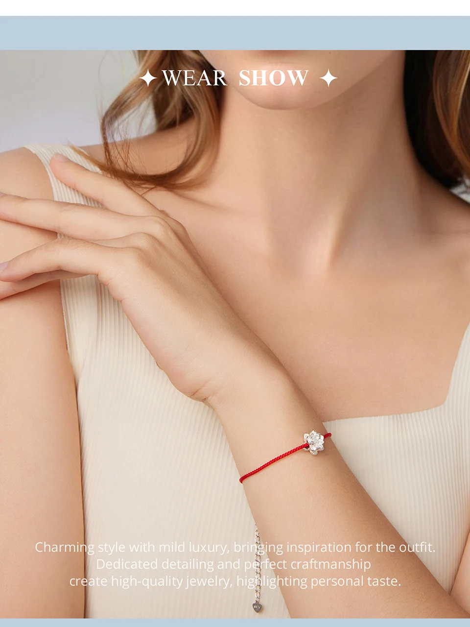 The lotus bracelet paired with a red cord bracelet to bring continuous good luck symbolizes purity and beauty.