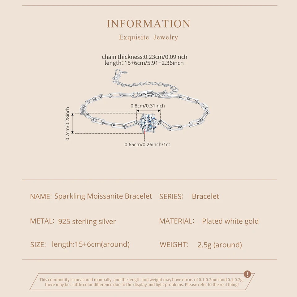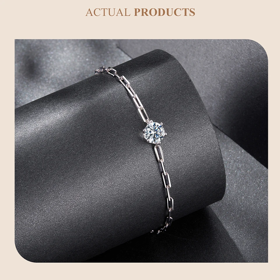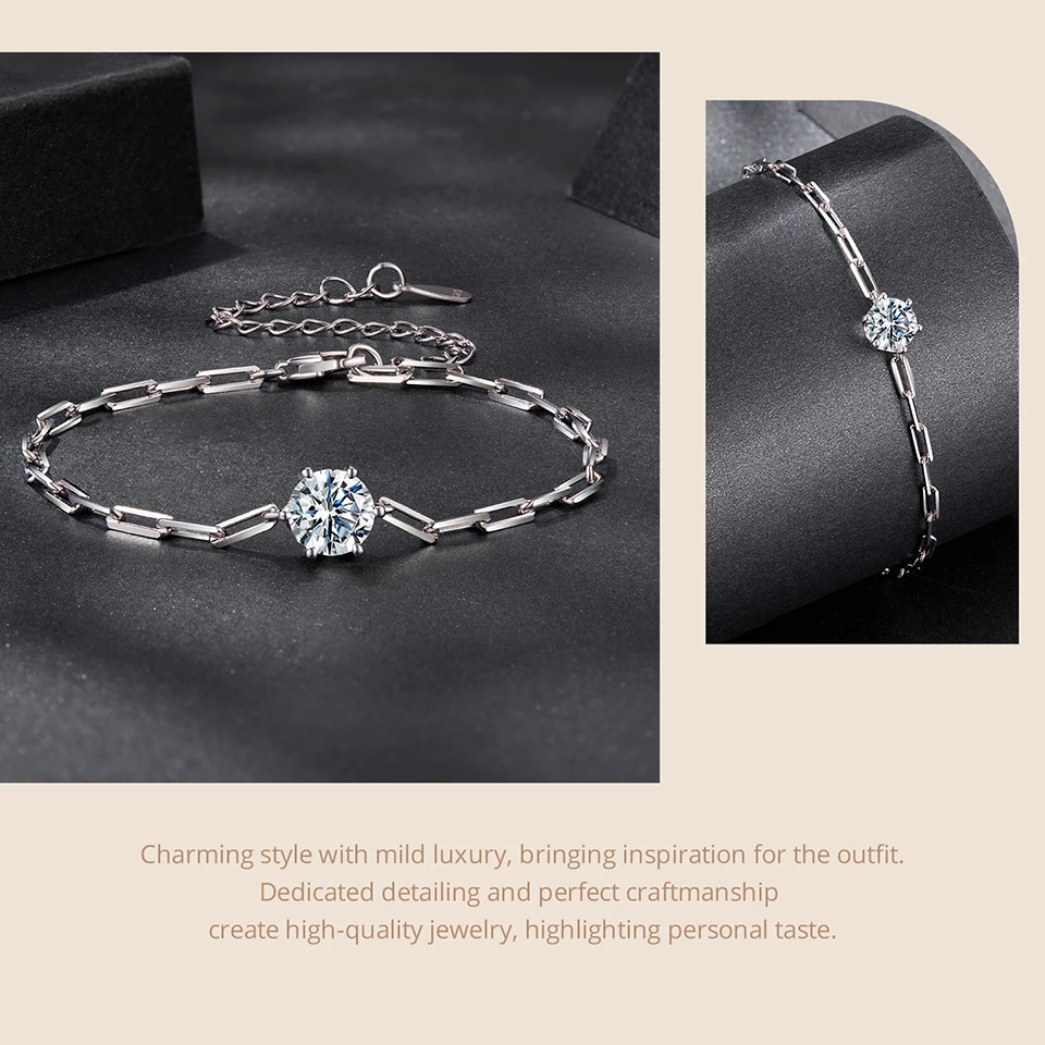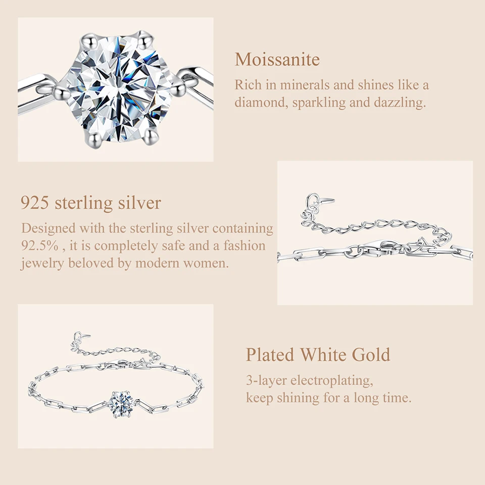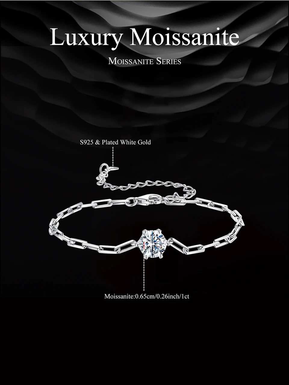1CT Moissanite Bracelet 6-Prong Setting Adjustable Link Wrist Chain for Women 925 Sterling Silver