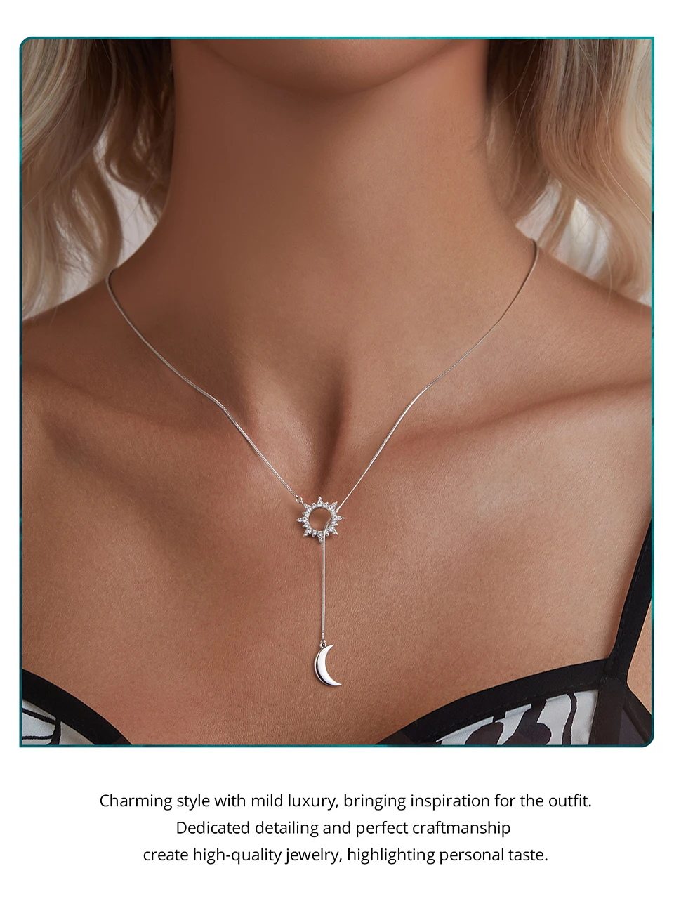 White Gold Plated Sun & Moon Y-shaped Necklace, High Quality 925 Sterling Silver