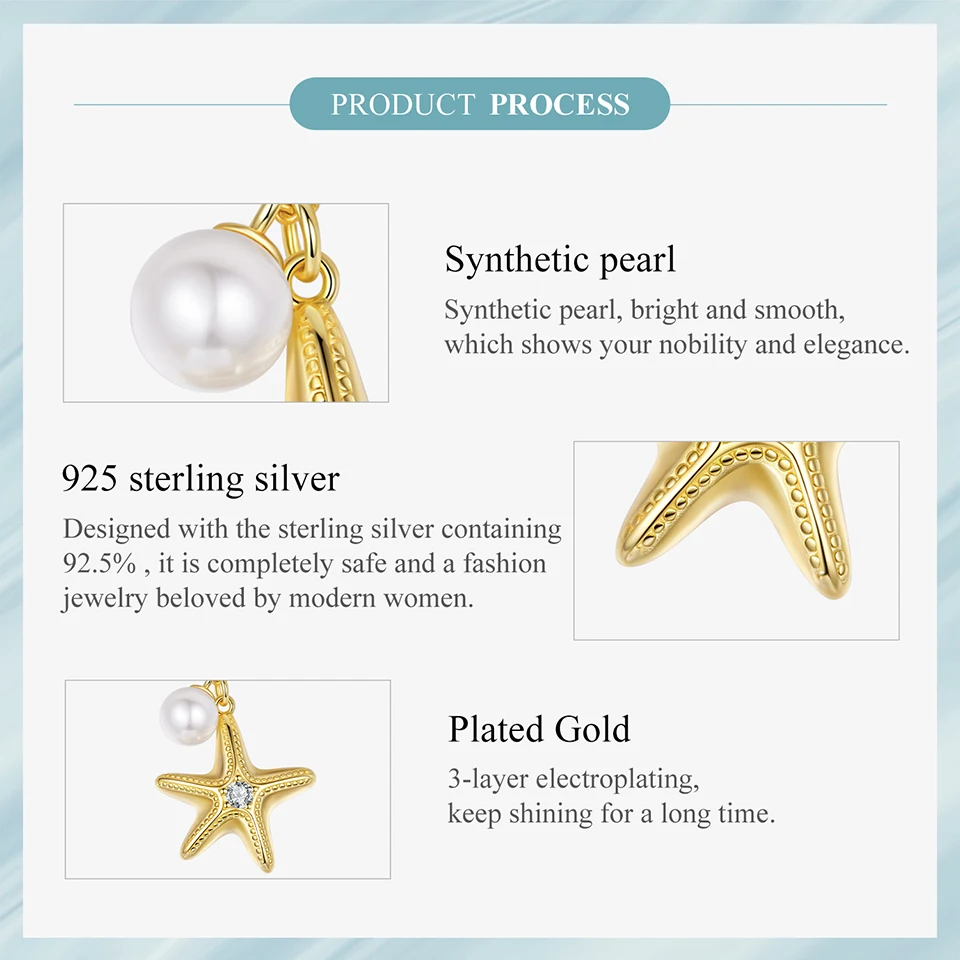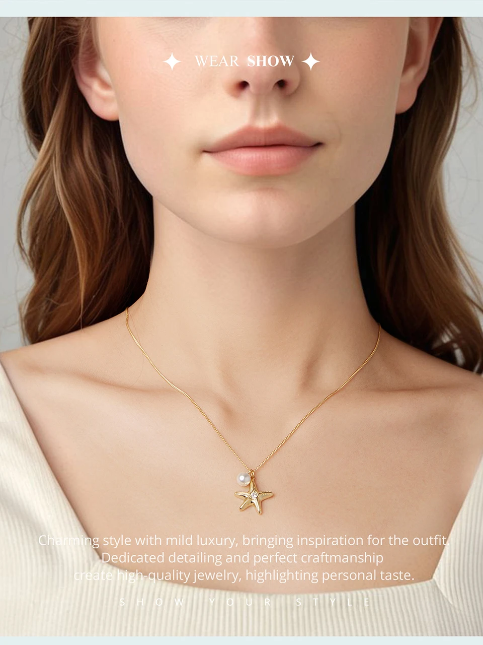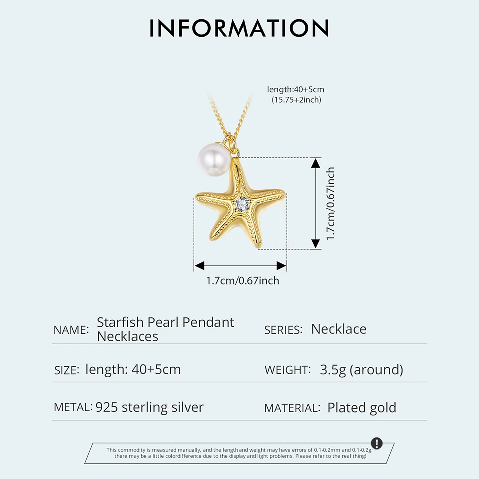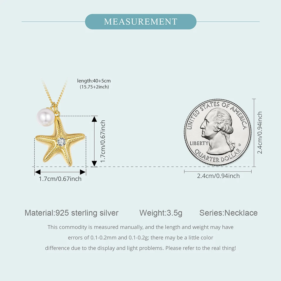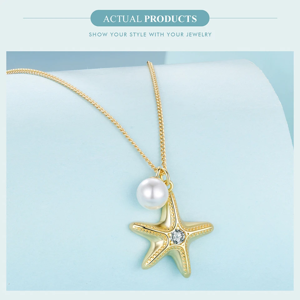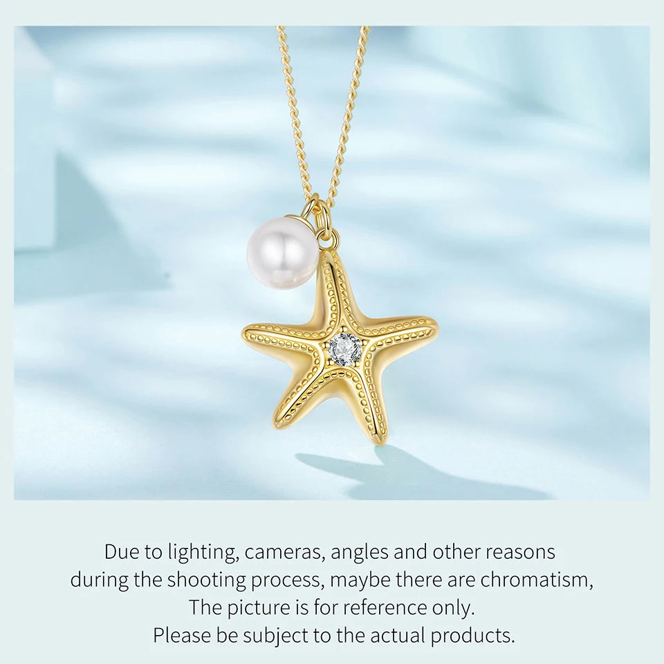 925 Sterling Silver Starfish Pendant Necklaces with Round Pearl Beads 18K Gold Basic Link Chain for Women