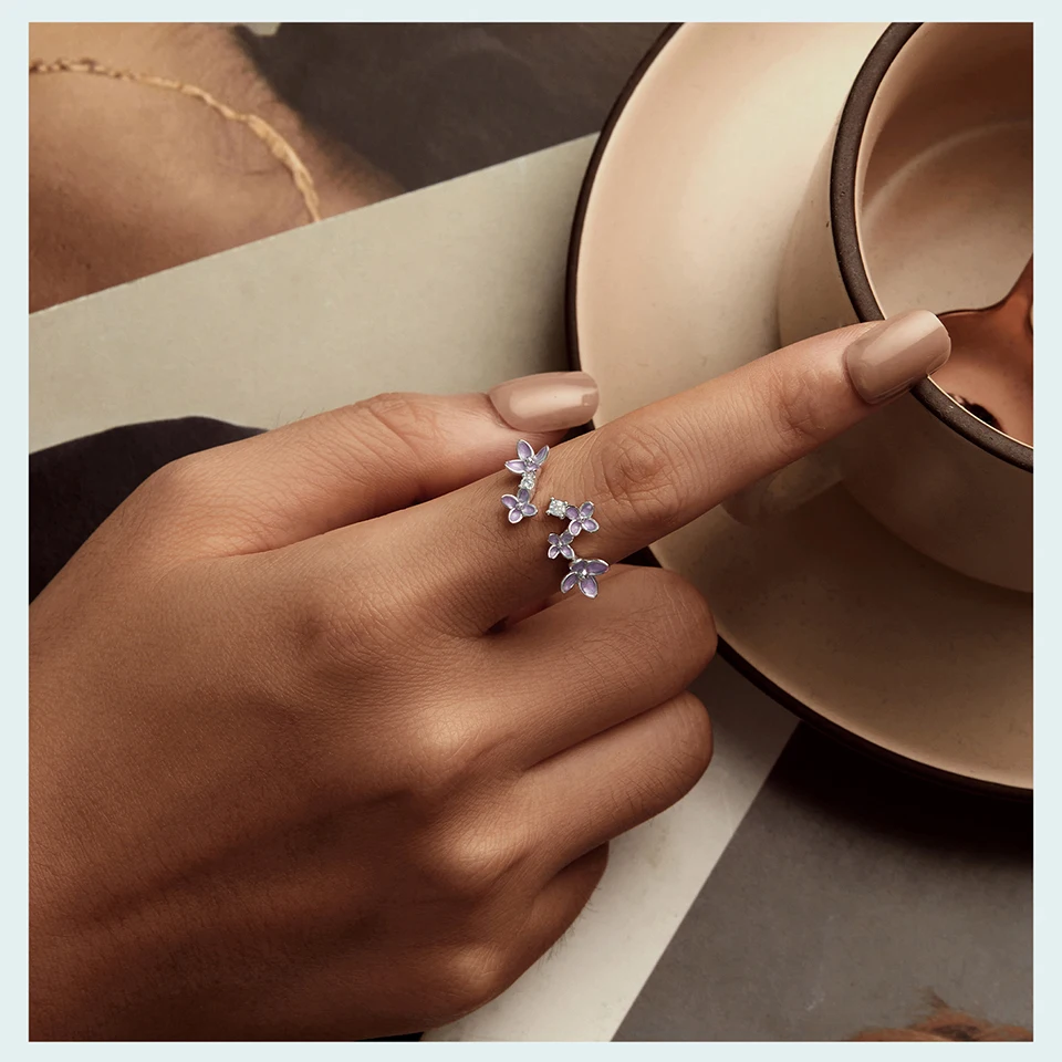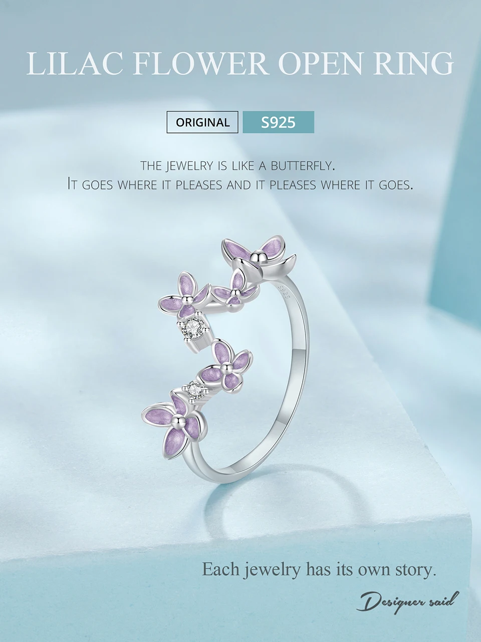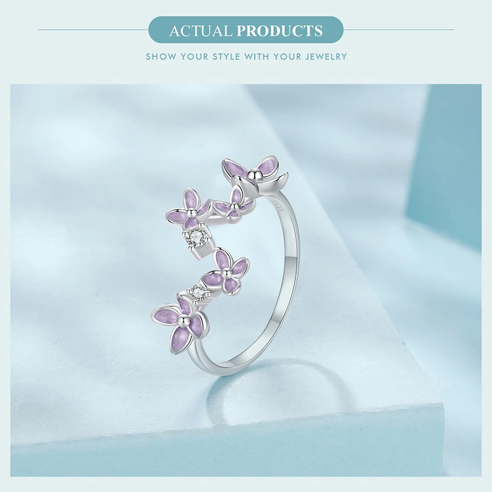 925 Sterling Silver Lilac Flower Adjustable Ring, White Gold Plated