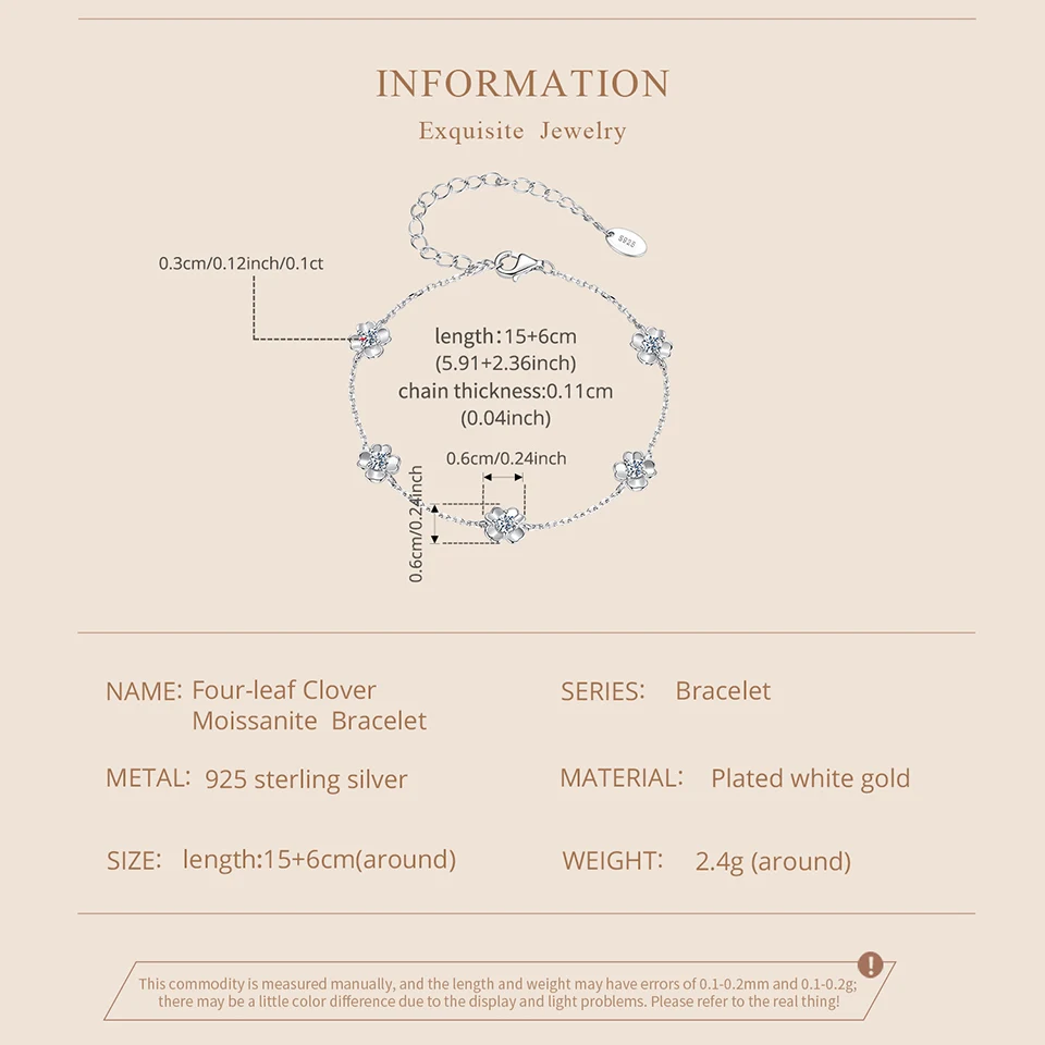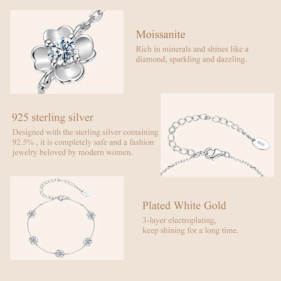 925 Sterling Silver 0.5CT Clover Moissanite Bracelet Flower Chain Link Adjustable for Women