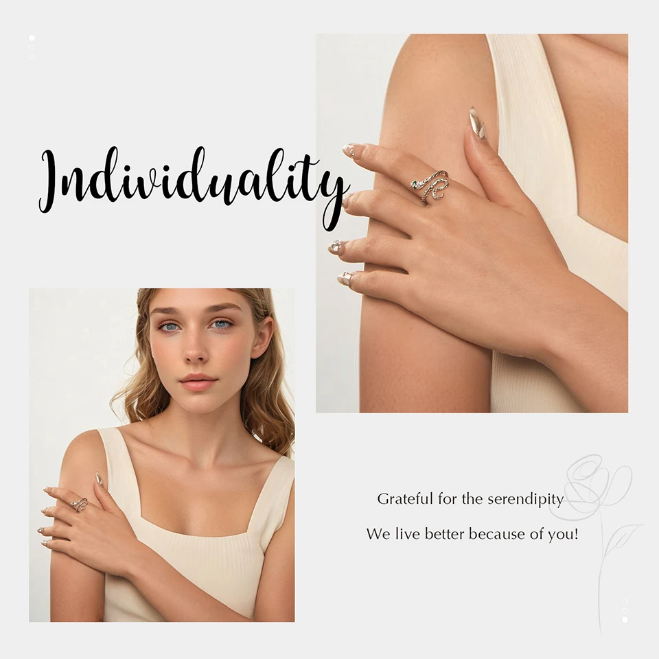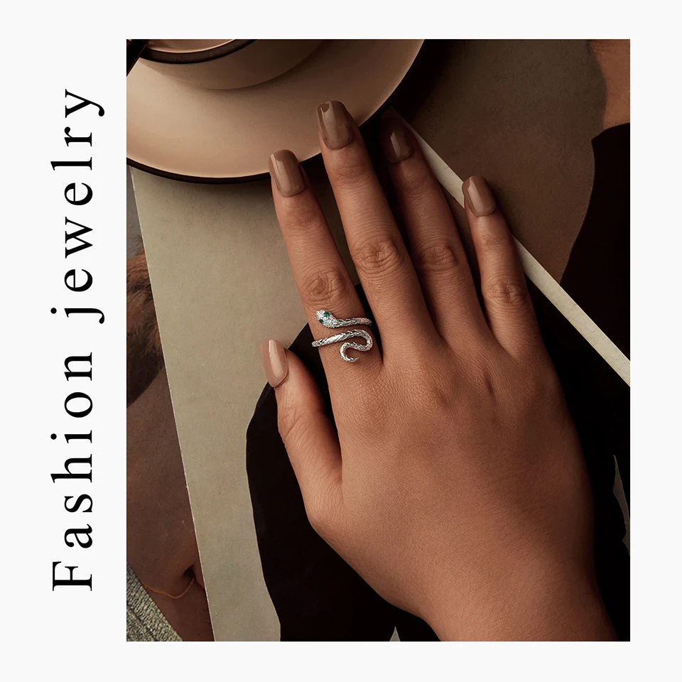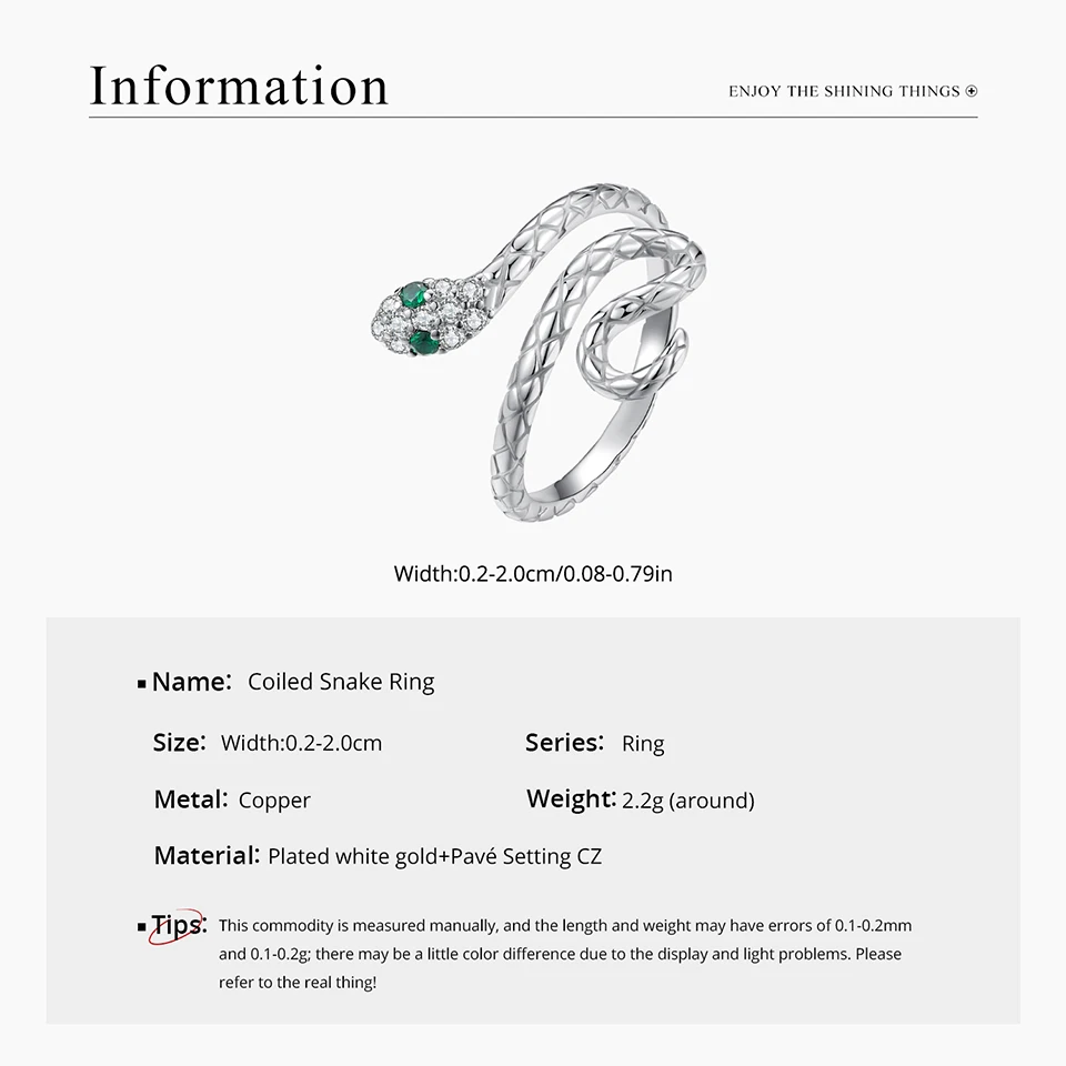 White Gold Plated Snake Ring with Emerald CZ Eye, Adjustable