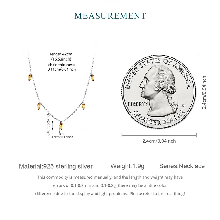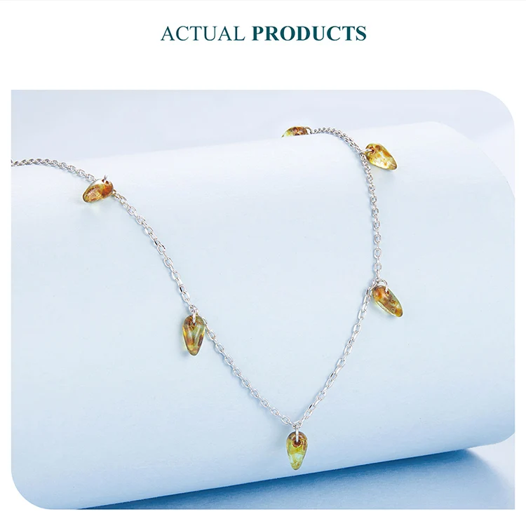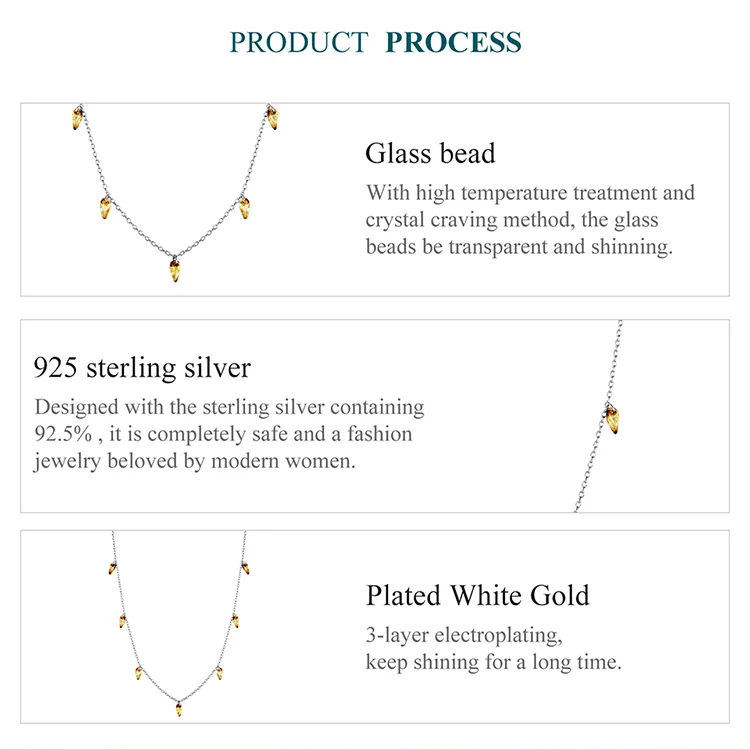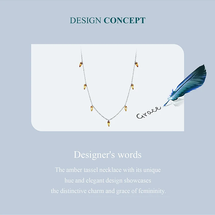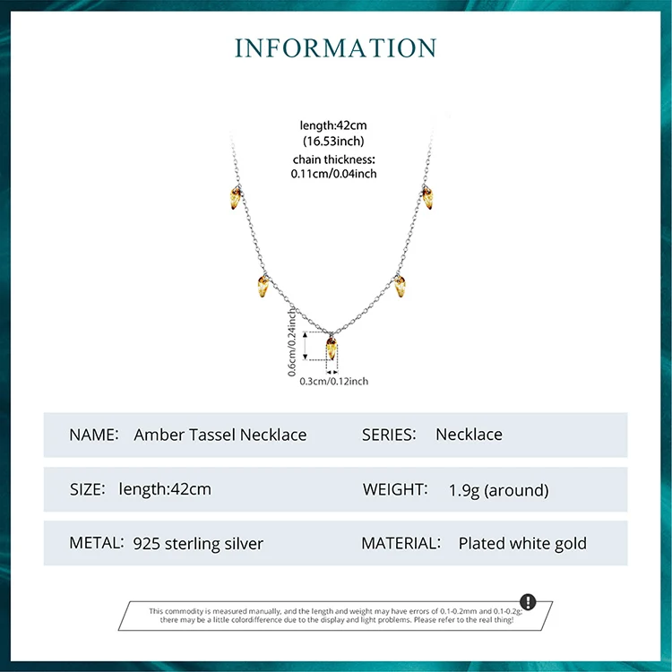 Genuine 925 Sterling Silver Tassel Necklace Amber Color Glass Beads Chain Original for Women