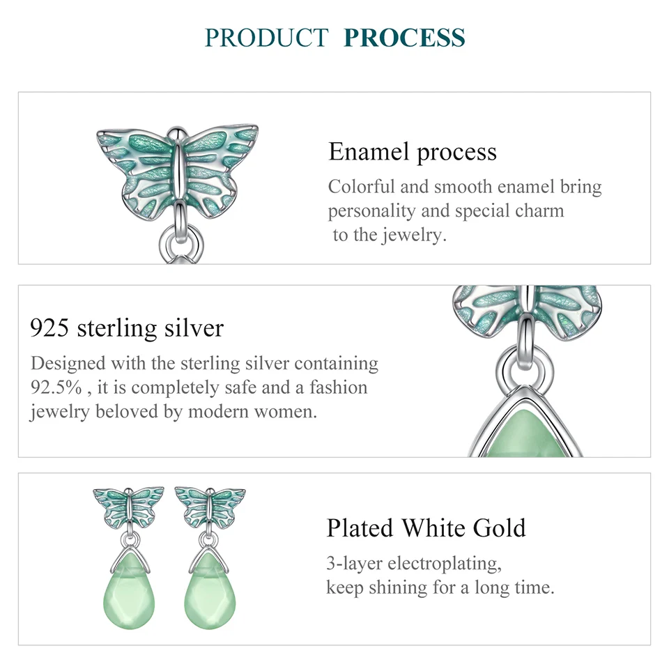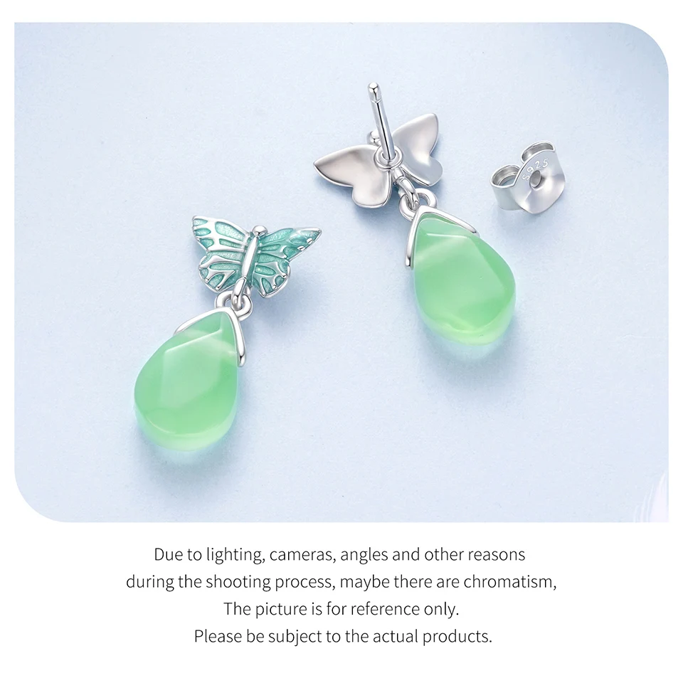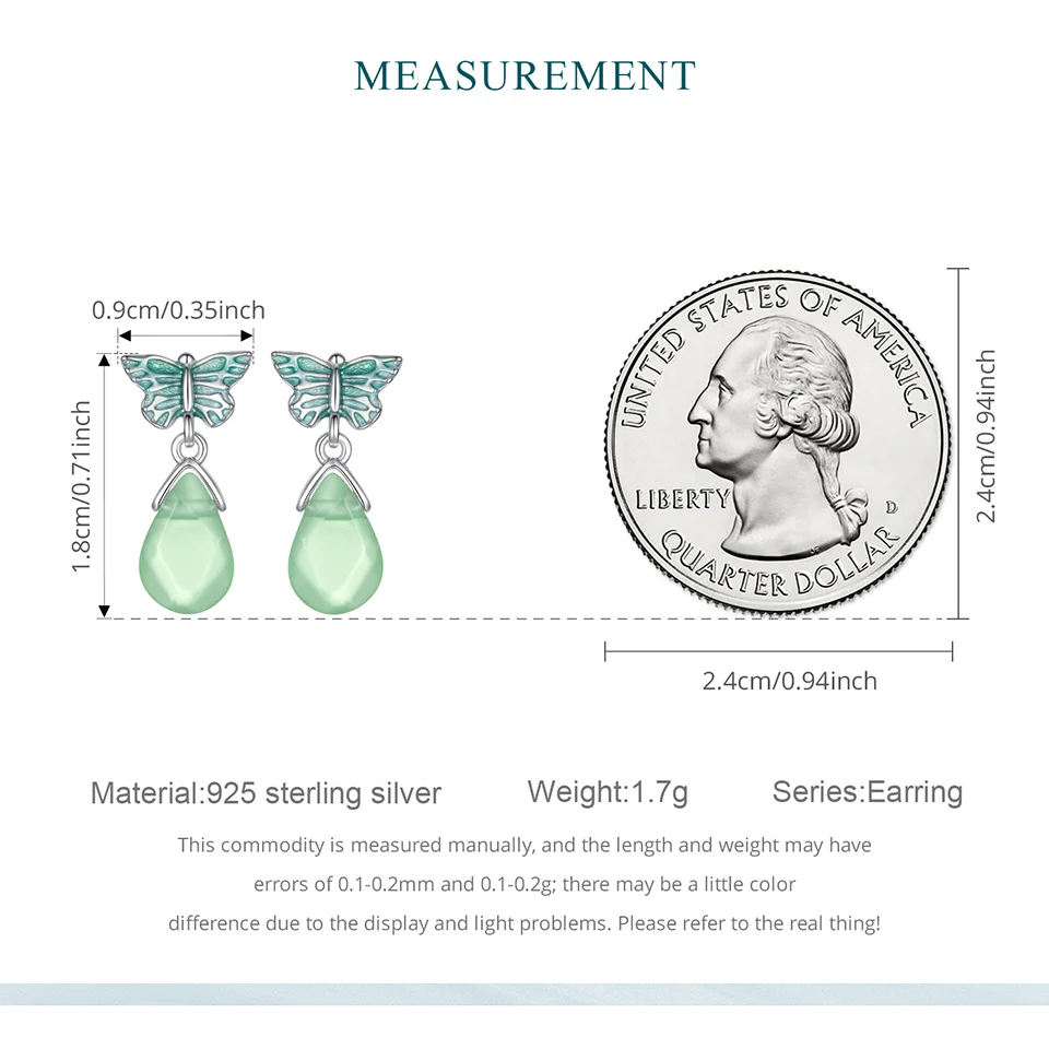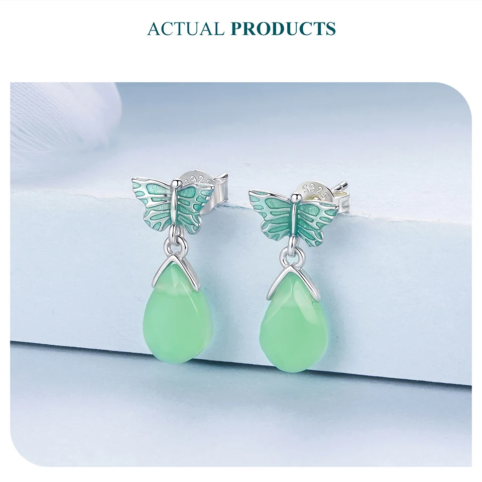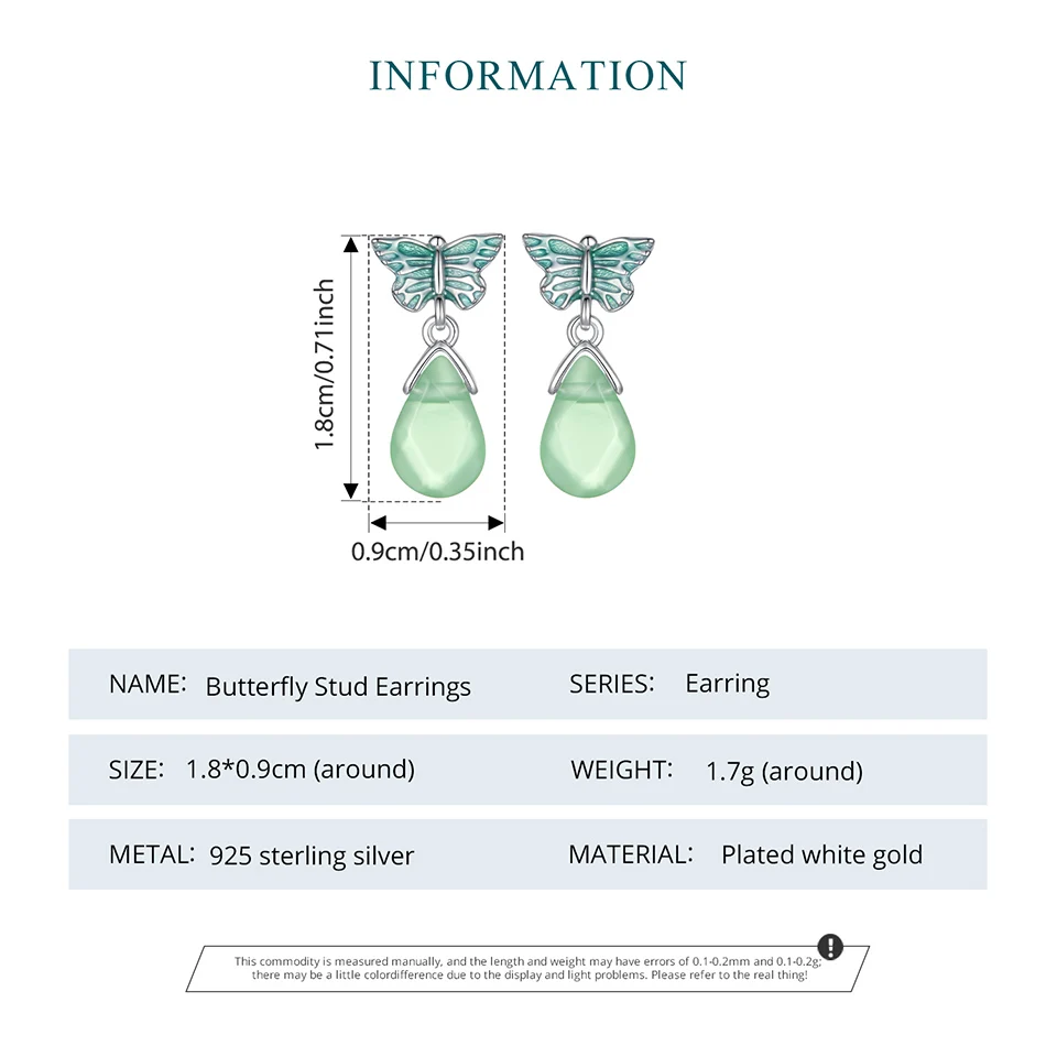 925 Sterling Silver Butterfly Stud Earrings for Women, Crystal Green Resin Teardrop Dangle Earrings