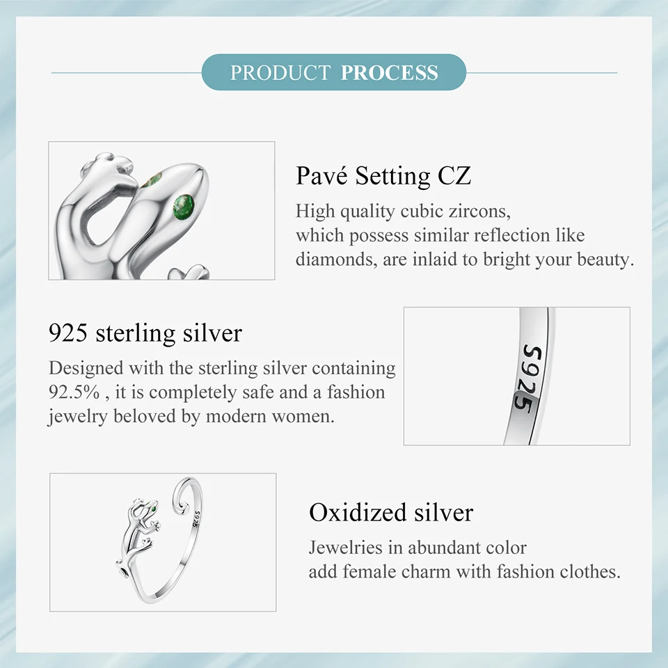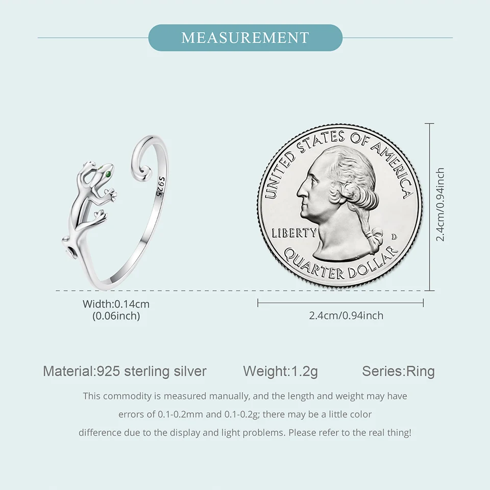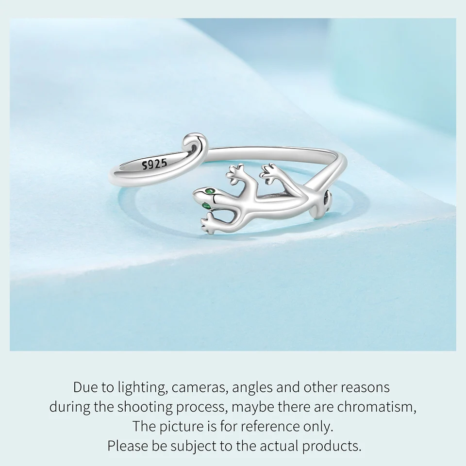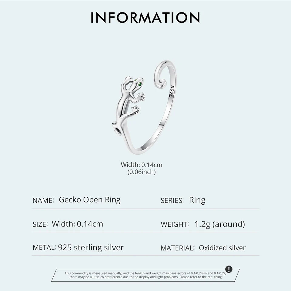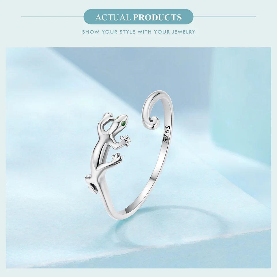 925 Sterling Silver Gecko Lizard Open Ring Lucky Animal Ring with Green Zircons