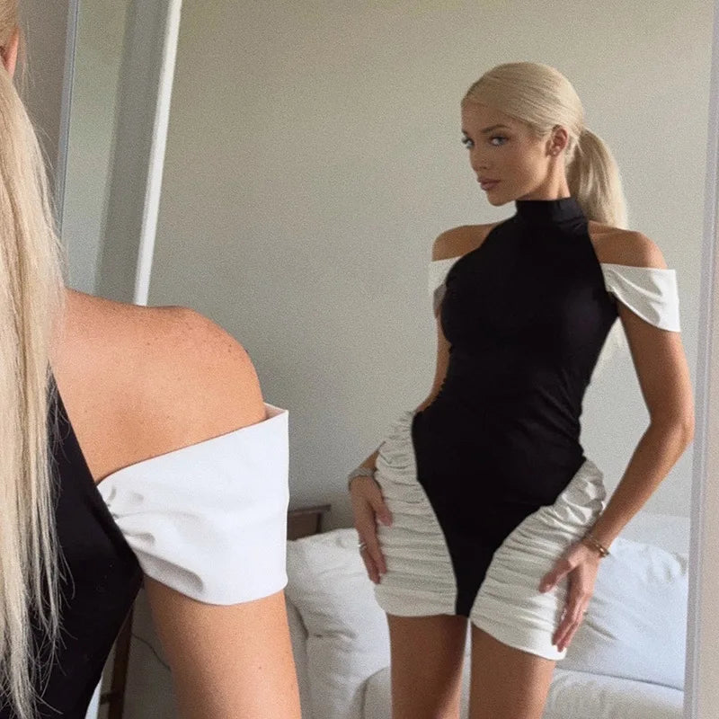 Black White Patchwork Pleated Evening Dress Female Short Night Club Outfit